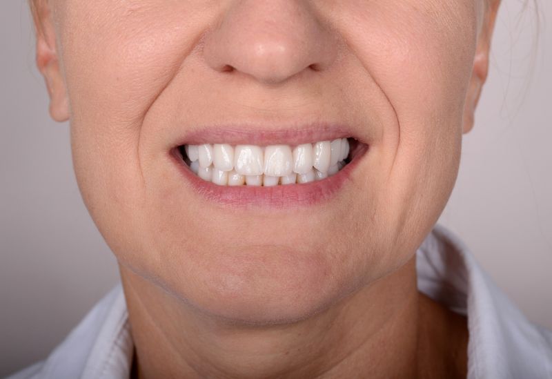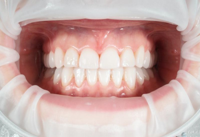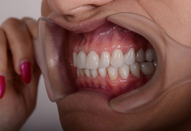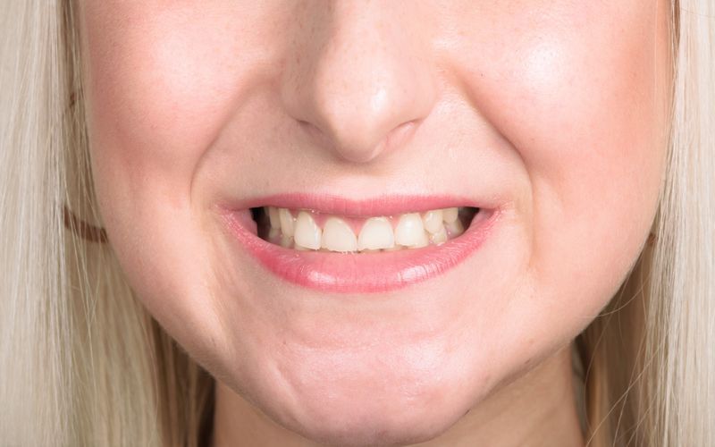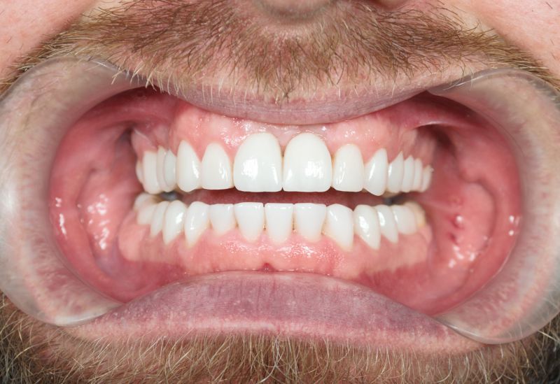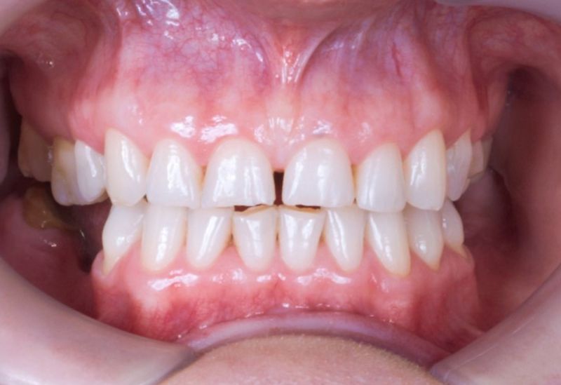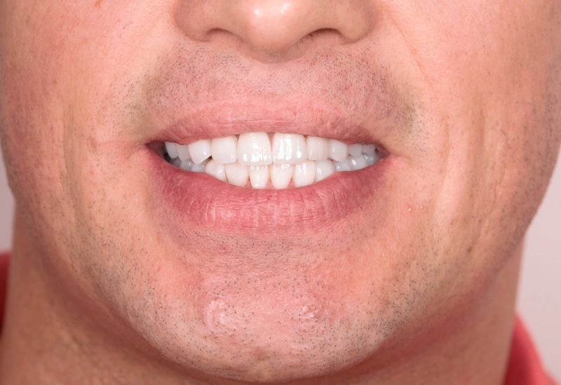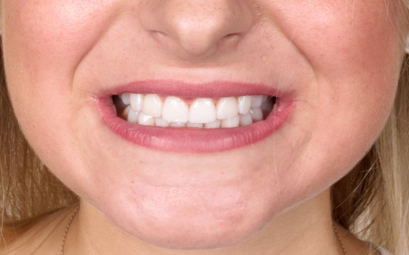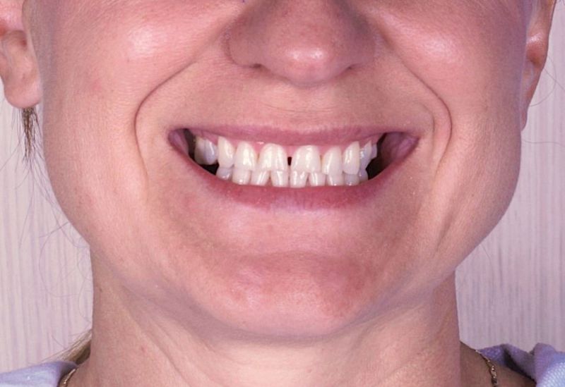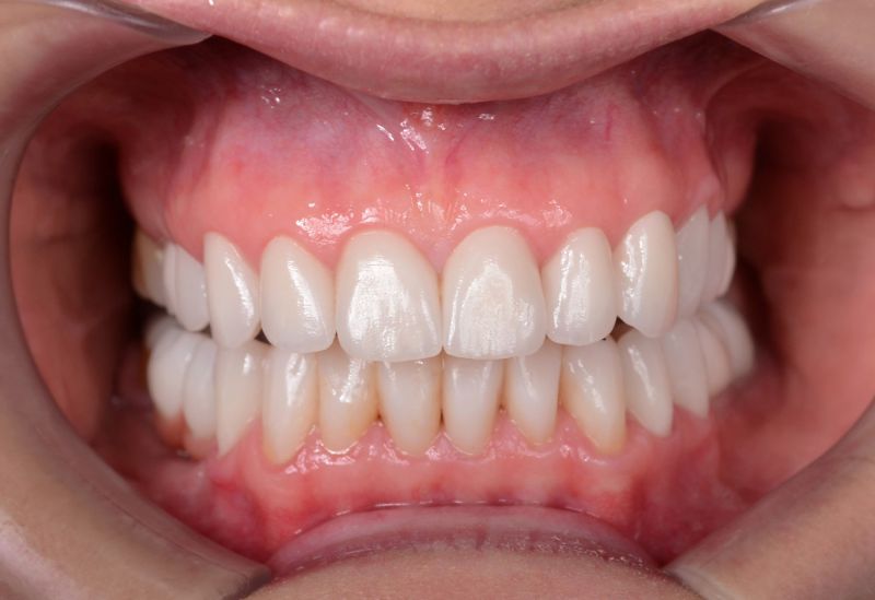 Starcie zębów powstałe w wyniku nieprawidłowego zgryzu. Zęby od kła do kła oraz drugie trzonowce odbudowane zostały metodą bezinwazyjną.