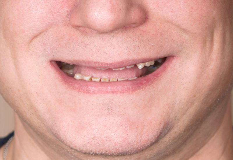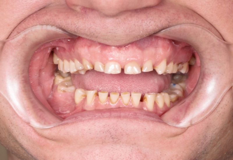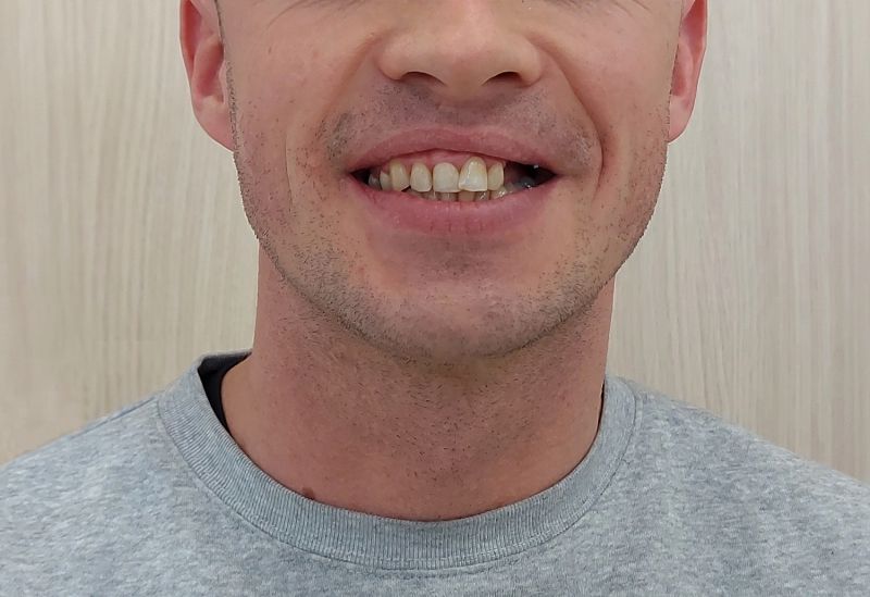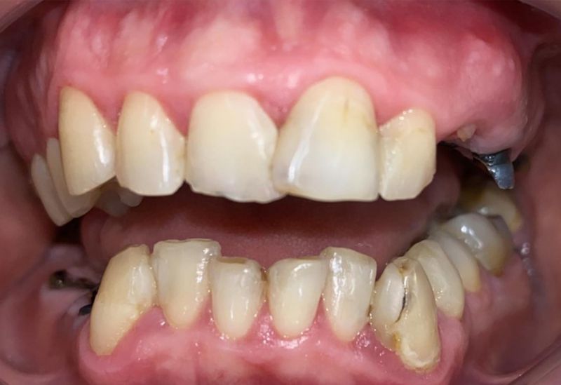 W Pana przypadku mieliśmy do czynienia z nadmiernie startymi zębami. Z powodu rozlegle zniszczonego uzębienia Pacjenta, należało przeprowadzić kompleksowe leczenie, które pozwoliło na przywrócenie estetyki uśmiechu, a także funkcjonalności zgryzu. U Pana konieczne było wszczepienie 4 implantów, na których w dalszej kolejności zostały wykonane korony porcelanowe oraz most. Starte zęby nadbudowane zostały natomiast metodą flow-injection.