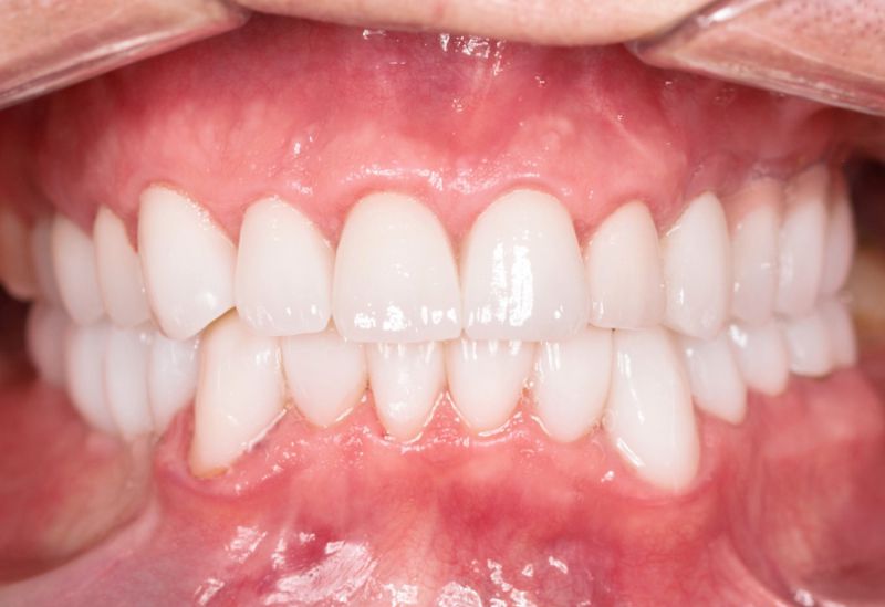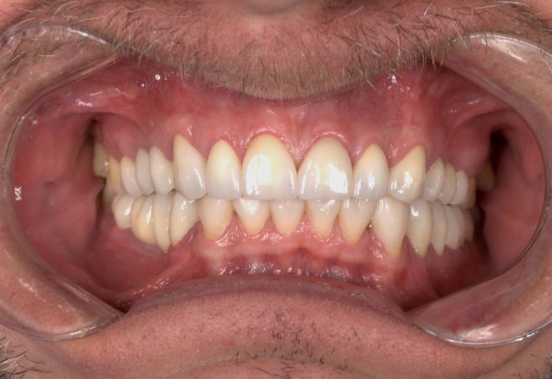 W Pana przypadku w miejscach braków zębów zastosowaliśmy implanty tytanowe, które po upłynięciu odpowiedniej ilości czasu mogliśmy obciążyć koronami pełnoceramicznymi. Zęby przednie górne zostały oszlifowane, tak aby móc wykonać także na nie korony pełnoceramiczne. W przypadku zębów dolnych połączyliśmy dwie metody odbudowy zębów, a mianowicie zastosowaliśmy metodę flow-injection oraz wyżej wymieniane korony pełnoceramiczne.