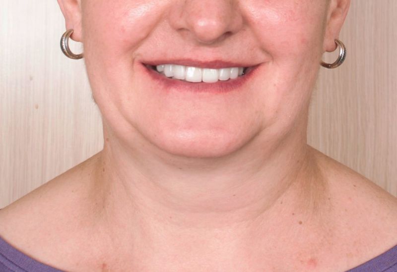 Ze względu na liczne braki zębowe Pacjentka zdecydowała się na zabieg wszczepienia implantów. W Pani przypadku, w miejscach braków zębów górnych wszczepiliśmy 6 implantów, na których w późniejszym czasie zostały wykonane korony pełnoceramiczne. Wykonaliśmy także korony pełnoceramiczne na część zębów własnych Pacjentki, a także zastosowaliśmy technikę flow-injection.