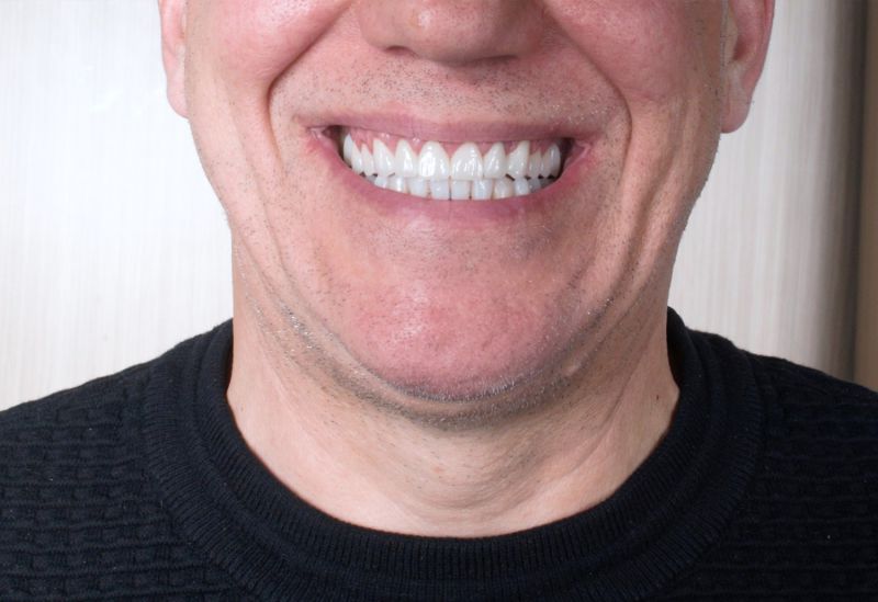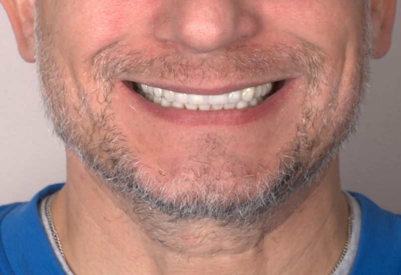 W Pana przypadku należało uzupełnić braki oraz odbudować wszystkie zęby zarówno w szczęce górnej jak i dolnej. Wszczepienie dwóch implantów zębowych pozwoliło na uzupełnienie brakujących zębów, natomiast wykorzystanie koron pełnoceramicznych, a także zastosowanie metody flow-injection na odbudowę startych zębów własnych. Teraz Pacjent może cieszyć się nowym, pięknym uśmiechem.